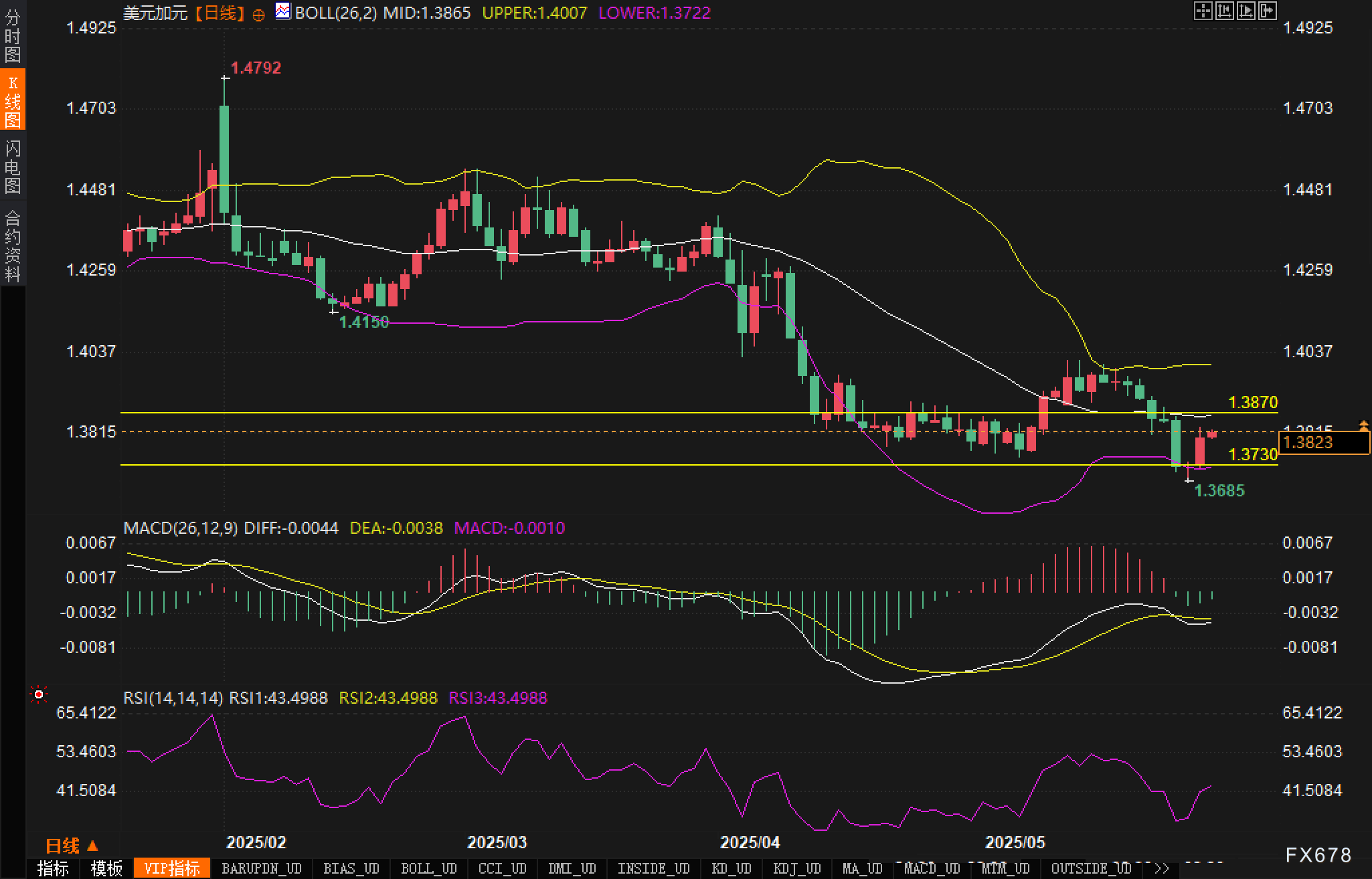 美国经济数据喜忧参半,但整体支撑美元表现。美国谘商会消费者信心指数从4月的86.0(修正后)大幅上升至5月的98.0,显示美国消费者乐观情绪升温,这为美元提供了广泛支撑。尽管4月耐用品订单环比下降6.3%,低于前值7.6%的增长(修正后从9.2%下调),但该数据仍好于市场预期的7.9%降幅。   明尼阿波利斯联储主席卡什卡利周二表示,在关税对通胀影响更加明朗之前,官员们应保持利率稳定。他警告不应忽视供应价格冲击的影响,这一鹰派立场为美元提供额外支撑。   原油价格承压对商品货币加元构成压力,为美元兑加元汇价上行创造有利条件。作为美国最大的石油出口国,加拿大经济与原油价格密切相关。市场正密切关注即将发布的加拿大第一季度GDP数据,预计同比增速将从2.6%放缓至1.7%。若数据意外强劲,可能在短期内提振加元。   从日线图来看,美元兑加元正在测试关键技术位。汇价目前运行在1.38水平附近,接近布林带中轨1.3865。上方面临1.3870的重要阻力,更高阻力位于1.4007的布林带上轨。下方支撑首先关注1.3730的水平线,跌破后将测试1.3722的布林带下轨。