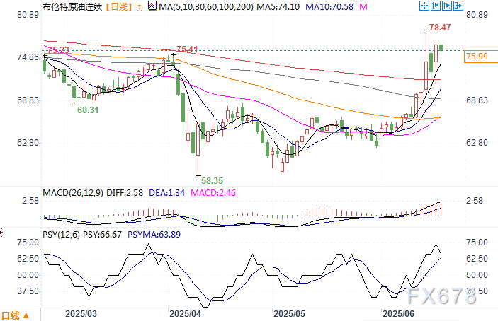 布伦特原油连续日线图 来源:易汇通   北京时间6月18日14:43 布伦特原油连续 报 76.10美元/桶