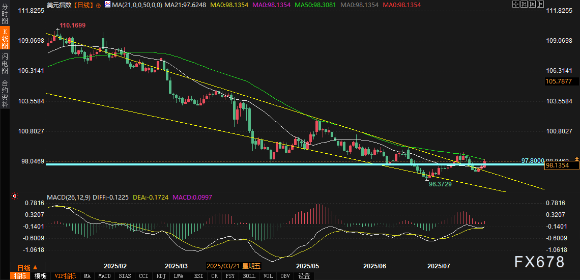基本面分析:贸易乐观情绪提振市场,美联储决议备受瞩目  上周末,美国与欧盟在苏格兰特朗普私人高尔夫球场达成突破性贸易协议,显著缓解了市场对跨大西洋贸易摩擦升级的担忧。据悉,该协议将美国对欧盟汽车、半导体和医药等主要进口商品的关税税率定为15%,远低于此前市场预期的30%。同时,协议包含“零对零”关税豁免,覆盖飞机及零部件、特定化学品、半导体制造设备、仿制药、农产品和关键原材料等领域。作为回报,欧盟承诺每年采购价值2500亿美元的美国液化天然气(LNG),三年总计7500亿美元,并计划在美投资6000亿美元,聚焦清洁能源、国防设备和制造业等战略领域。尽管现有钢铝关税仍维持在50%高位,但双方官员暗示未来可能通过配额制逐步替换。  这一协议被美国总统特朗普称为“有史以来最大交易”,其乐观表态进一步巩固了市场信心,推动标普500指数期货上涨0.4%,延续上周连创五次历史新高的势头。欧洲股市期货同样上涨1%,反映市场对贸易紧张局势缓和的积极反应。然而,欧洲内部对协议的评价出现分歧。德国总理弗里德里希·默茨表示,协议“保住了我们的核心利益”,但法国和匈牙利领导人则批评其过于倾向美国。一位比利时官员的尖锐评论称“特朗普在谈判桌上完胜冯德莱恩”,引发欧洲市场内部热议。尽管如此,欧盟委员会主席乌尔苏拉·冯德莱恩强调,协议为“不确定时期”带来了“稳定性和可预测性”,展现了外交上的务实成果。  然而,市场乐观情绪并非没有隐忧。知名经济学家对协议的长期影响提出质疑。一位美国经济学家指出,15%的关税仍将推高美国消费者和制造商的成本,尤其是钢铝等关键原材料高达50%的税率,可能对制造业构成压力。另一位密歇根大学学者进一步警告,即便关税税率看似温和,消费者最终仍将承担大部分成本,协议的实际经济效益可能被高估。此外,协议需经欧盟成员国和欧洲议会批准,立法程序的不确定性为市场增添了变数。  与此同时,市场关注点正转向本周的密集经济数据和美联储决议。周二的美国消费者信心指数和JOLTS职位空缺报告将为市场提供经济动能的初步线索。周三的ADP就业数据、二季度GDP以及美联储利率决定将成为重头戏。周四的PCE通胀数据和初请失业金人数,以及周五的非农就业(NFP)、平均时薪和ISM制造业PMI,将进一步为美元走势定调。美联储本周料将维持利率不变,但市场将密切关注其对通胀和经济前景的措辞,尤其是在近期贸易乐观情绪与关税言论并存的背景下。  此外,高层级中美贸易谈判将于本周在斯德哥尔摩重启,美国财长斯科特·贝森特与中国副总理何立峰会面,旨在8月12日关税休战到期前寻求延长协议。美商务部长霍华德·卢特尼克强调,8月1日的关税截止日期“没有延期余地”,凸显谈判的紧迫性。部分交易员对谈判前景持谨慎态度,认为短期内难以达成实质性突破,美元可能因此继续受到避险情绪的间接支撑。  技术面分析:DXY反弹动能增强,50日均线成关键阻力  从技术面看,美元指数(DXY)近期走势展现出较强的反弹动能。DXY此前在本月初突破下降楔形形态,确立看涨结构,但随后在触及99.00的心理关口后未能延续涨势,一度回落至两周低点97.00附近。然而,买盘在楔形阻力转支撑区域(97.80-98.00)果断介入,守住关键支撑,令突破的有效性暂时得以维持。截至周一,DXY报98.20,站稳21日指数移动平均线(EMA,97.6276),并逼近50日EMA(98.3090)的阻力位。  技术指标进一步佐证了反弹动能的增强。日线图上,相对强弱指数(RSI)升至53,表明多头动能正在恢复。MACD指标维持看涨形态,尽管快线、慢线仍处于零线以下,暗示反弹尚处早期阶段。柱状图已翻转为正,反映上周回落后的动能改善。若DXY能有效突破50日EMA(98.3090),将为重测99.00心理关口打开空间。反之,若未能守住97.80支撑,可能触发进一步回调,目标指向97.50甚至97.00。  值得注意的是,DXY当前价格与21日EMA的正乖离表明短期超买风险正在累积,但整体趋势仍偏向看涨。多位技术分析师指出,DXY的反弹可能受到本周数据密集发布的驱动,尤其是非农就业和PCE通胀数据若超预期,可能进一步推高美元。