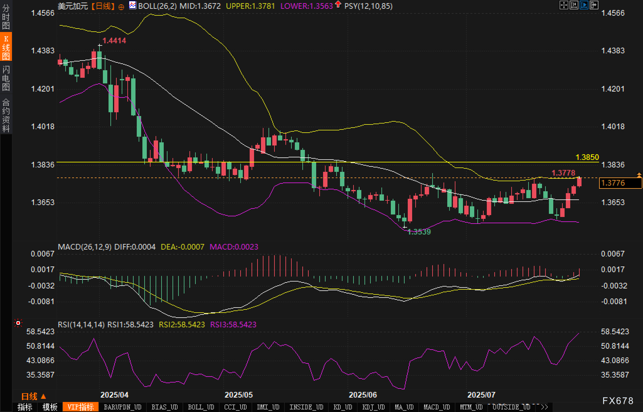 本周美元的强势主要源于贸易领域的积极进展。美国与欧盟的新关税安排缓解了市场对全球贸易摩擦可能进一步升级的担忧,支撑了美元的避险与基本面需求。交易员认为,近期的关税安排在谈判力度与市场承受度之间取得了平衡,助推美元延续升势。  美元指数触及99.00关口,为近一个月高点,显示美元买盘需求强劲。另一方面,加拿大经济近期数据表现温和,尤其在能源价格波动和出口增长放缓的背景下,加元动能不足。虽然加拿大央行预计将维持利率不变,但在美国货币政策持续强硬的衬托下,加元显得相对脆弱。  值得关注的是,今日晚间将公布的美国6月JOLTS职位空缺数据预计为755万,低于5月的777万。若数据优于预期,将进一步巩固美元的强势格局;若逊于预期,或为汇价带来短线回调压力。整体来看,市场在央行决议前保持谨慎,短线资金流向仍偏向美元。  技术面:  从日线图来看,美元兑加元在近期持续反弹,再度逼近关键阻力位。布林带显示,中轨位于1.3672,当前汇价运行在布林上轨附近,技术面动能偏多。布林带上轨1.3781已构成首要阻力位,若突破,则进一步上行目标将指向1.3850关口。