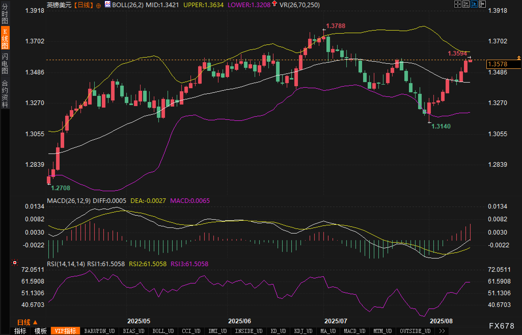 英国强劲的经济数据表明,经济可能比此前预期的更为稳健,这为英国央行(BoE)避免进一步降息创造了有利条件,支撑了英镑的上涨。此前,英国央行在本月的货币政策会议上将利率下调了25个基点至4.00%,并维持了“渐进谨慎”的货币扩张指导。尽管降息决定过程非常紧张,四位成员支持维持利率不变,但最终的决定还是倾向于降息。 与此同时,由于市场普遍预期美联储将在9月的货币政策会议上降息,美元出现了回调。美元指数(DXY)一度下滑至两周低点97.60附近,进一步支撑了英镑的上涨。交易员几乎已完全定价了美联储将在9月降息25个基点的预期,根据CME FedWatch工具,市场对美联储降息的预期愈加增强,且美联储降息的幅度和时机或将对美元产生较大压力。 技术面 从技术面来看,英镑/美元在近期的强劲反弹后,价格已经接近1.3600水平,这一价格区间也是布林带的上轨区域。图表显示,在经历了一段时间的整理和下行后,汇价在1.3140附近找到支撑,反弹至当前的阻力区附近。