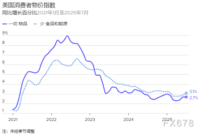 彭博社调查的经济学家预计,CPI数据将显示总体价格同比上涨2.9%,较6月和7月2.7%的涨幅有所加速。结合周三生产者价格指数(PPI)同比2.6%的读数,这些数据很可能表明价格涨幅仍远高于美联储2%的目标水平。