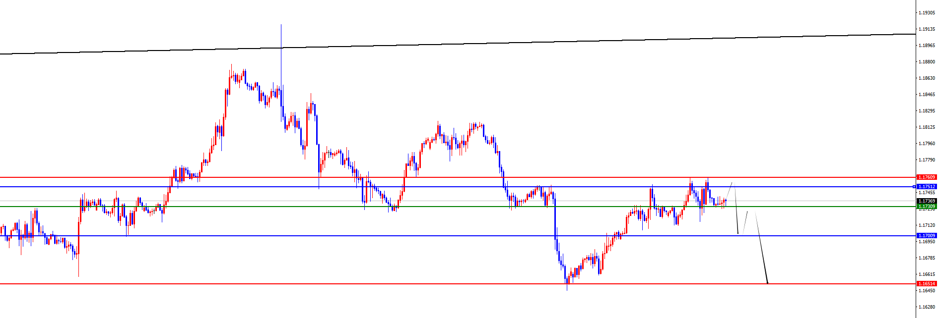 美指97.60-70区间多,防守5美金,目标98-98.50 欧美 欧美方面,周二欧美价格总体呈现上涨的状态。当日价格最低下跌至1.1711位置,最高上涨至1.1761位置,收盘于1.1733位置。回顾周二欧美市场表现,在早盘期间价格先向下回踩,之后测试到四小时支撑后向上反弹,同时价格在测试到日线阻力后止步,最终日线阳线收尾,但是目前价格压制在日线阻力。 从多周期分析,从月线级别来看,欧美受撑于1.1100位置,所以价格在此位置之上长线多头对待。从周线级别看价格受撑于1.1700区域的支撑,此位置是中线走势的多空分水岭,本周重点关注周线收盘能否收在此位置之下是关键。从日线级别,价格在上周跌破日线支撑,则前期支撑变关键阻力,周初价格持续压制在此,所以在此位置没有上破前持续看承压,下方关注周线支撑得失,下破后才会打开空间。从四小时看,目前四小时支撑于1.1730位置,价格在此区域震荡,后续关注进一步震荡后下破表现。